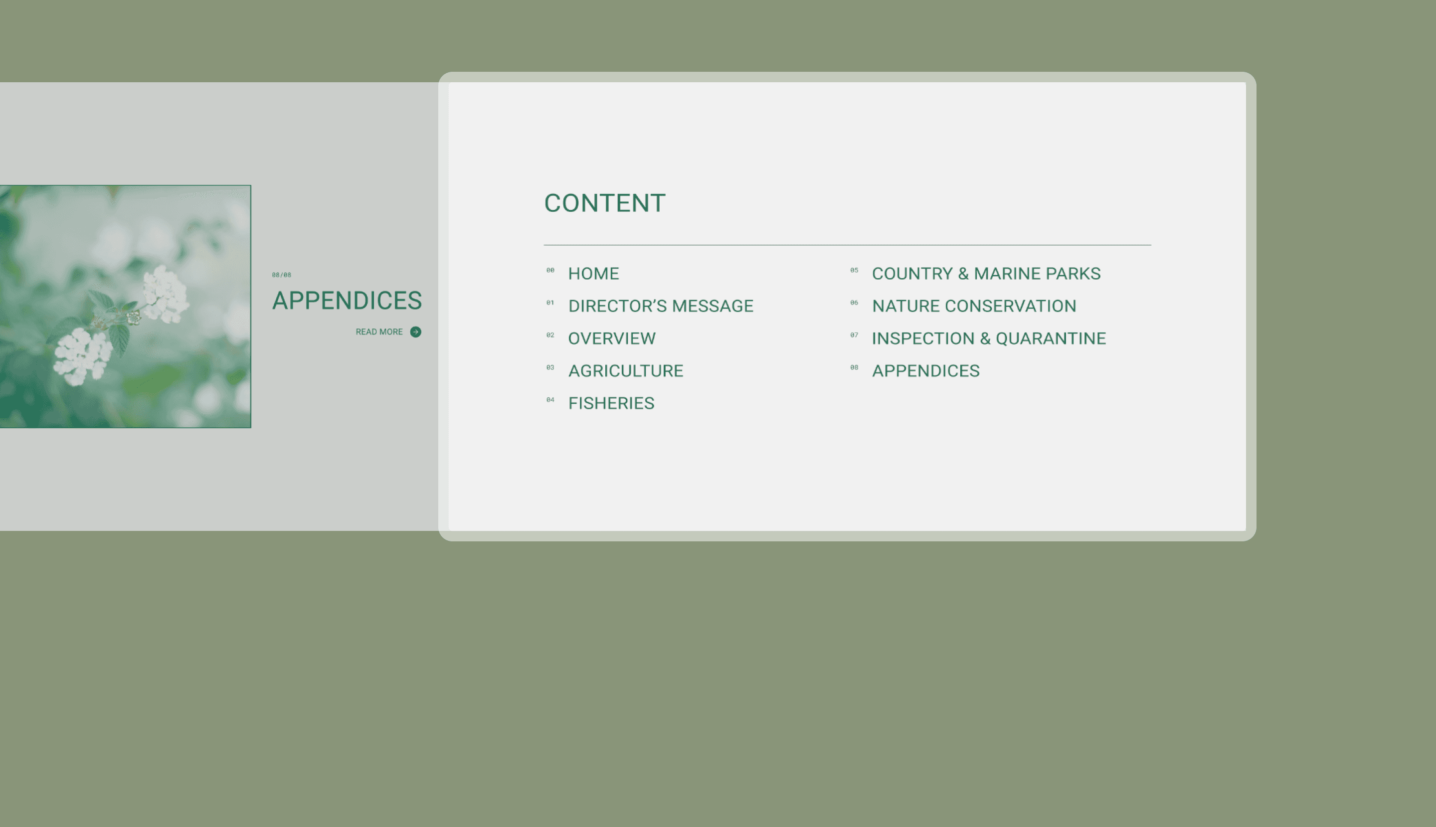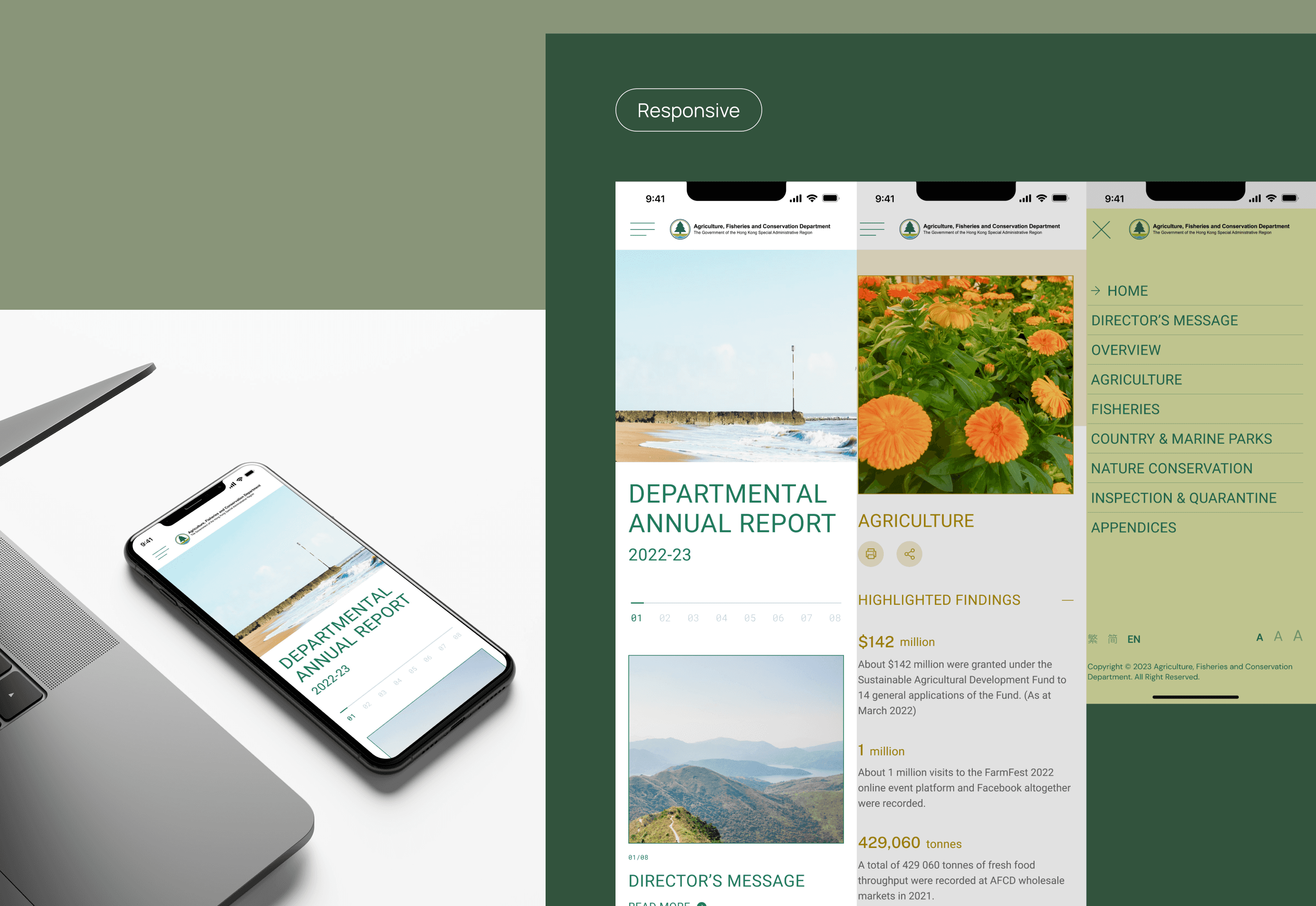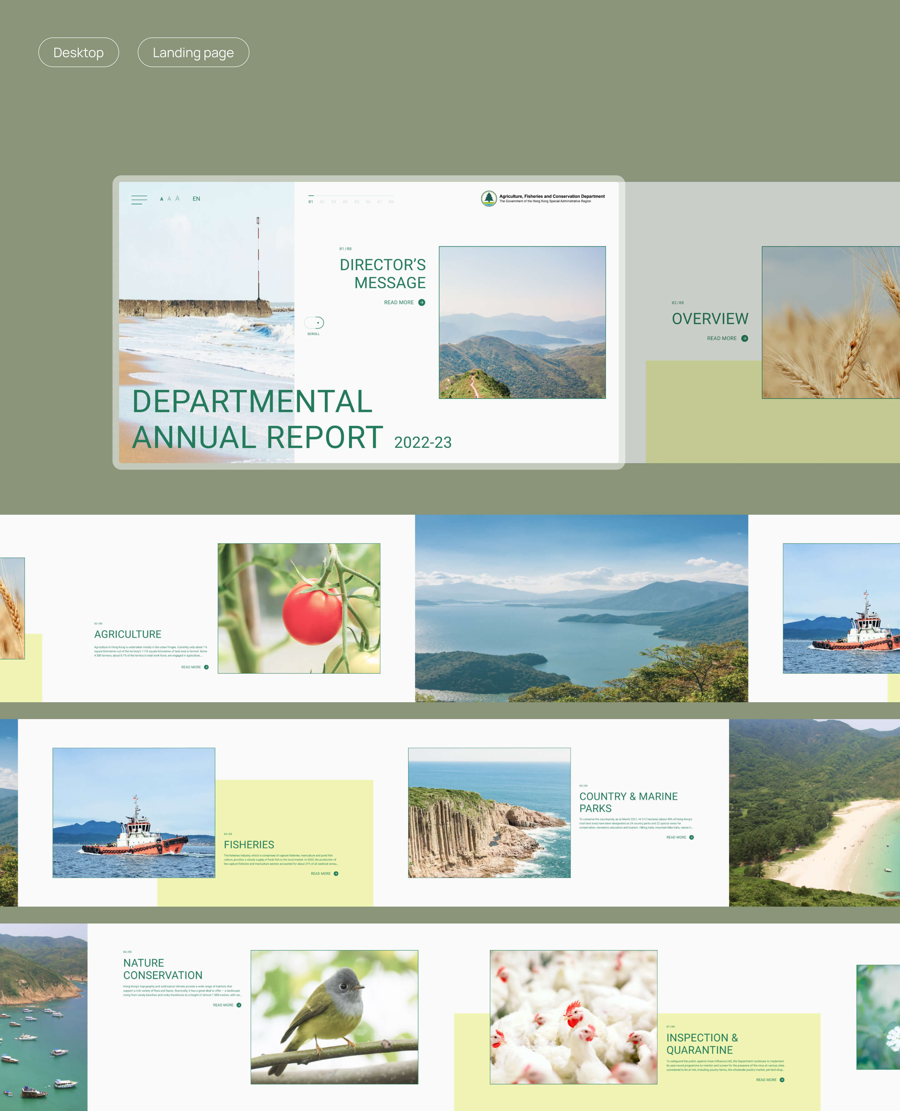 The Agriculture, Fisheries and Conservation Department (AFCD) in Hong Kong manages policies on agriculture, fisheries, and conservation. Their annual report showcases achievements across five branches.