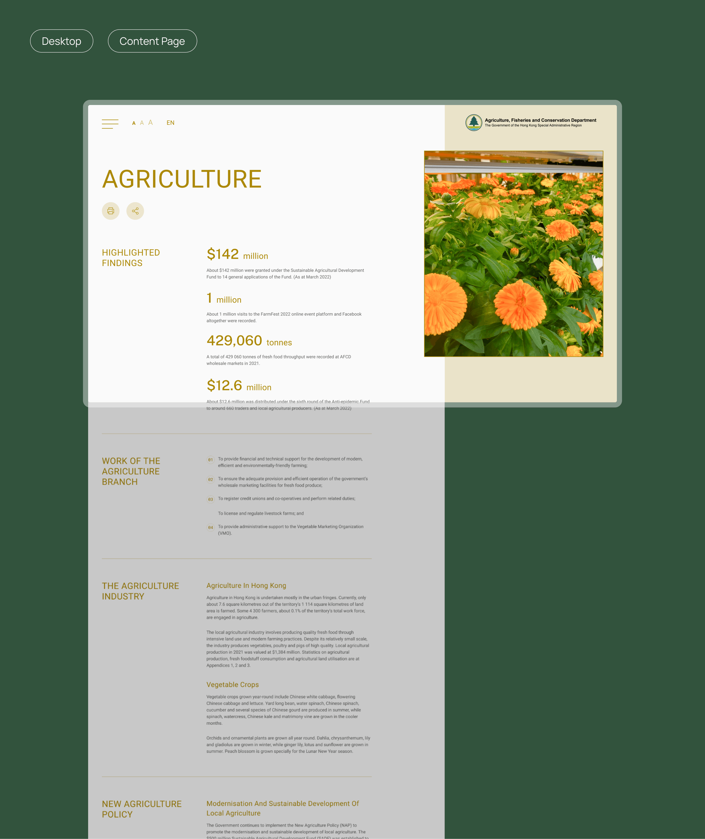 The layout, while functional, could be refined to align more closely with contemporary design trends and AFCD’s brand identity.