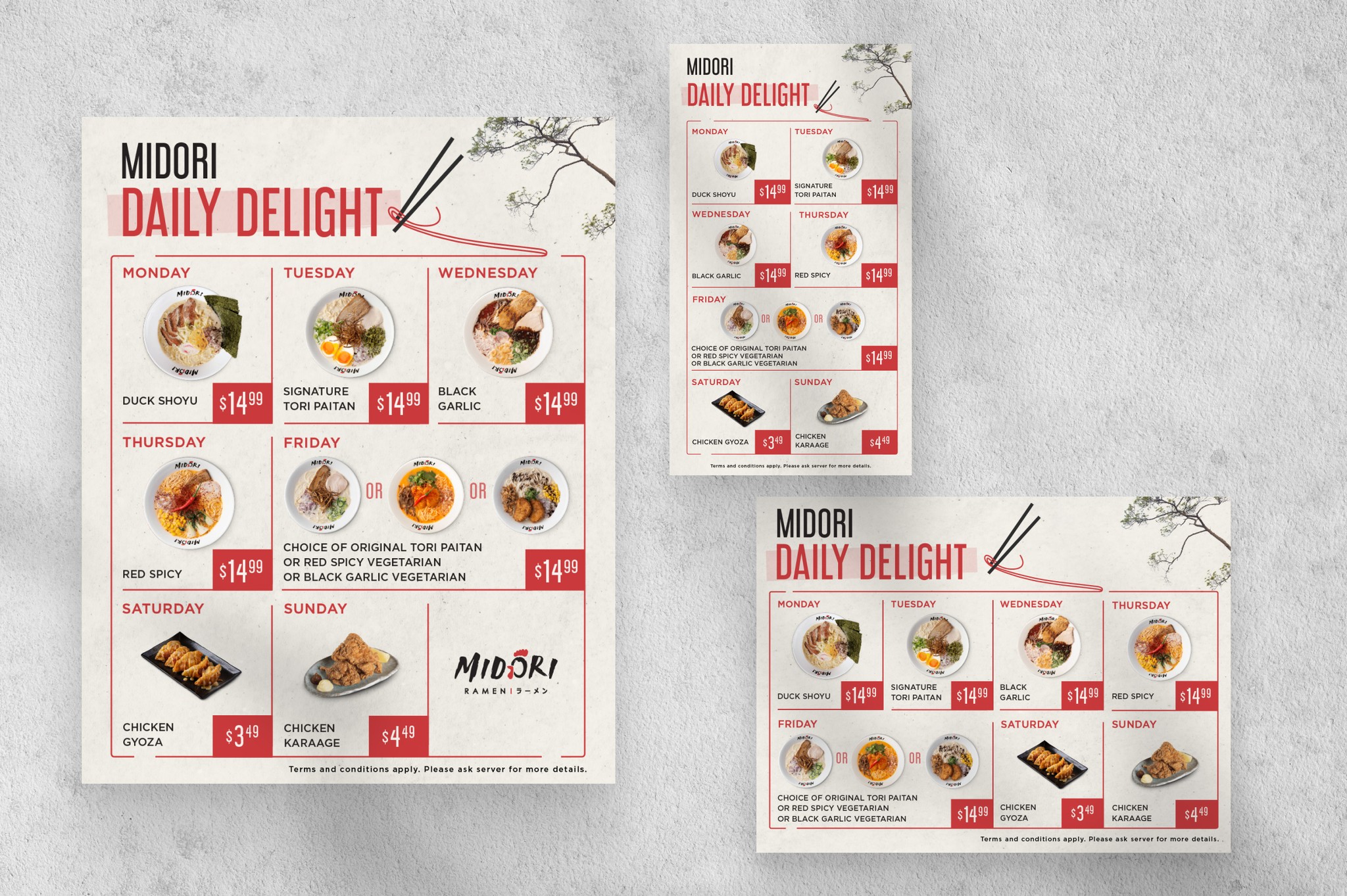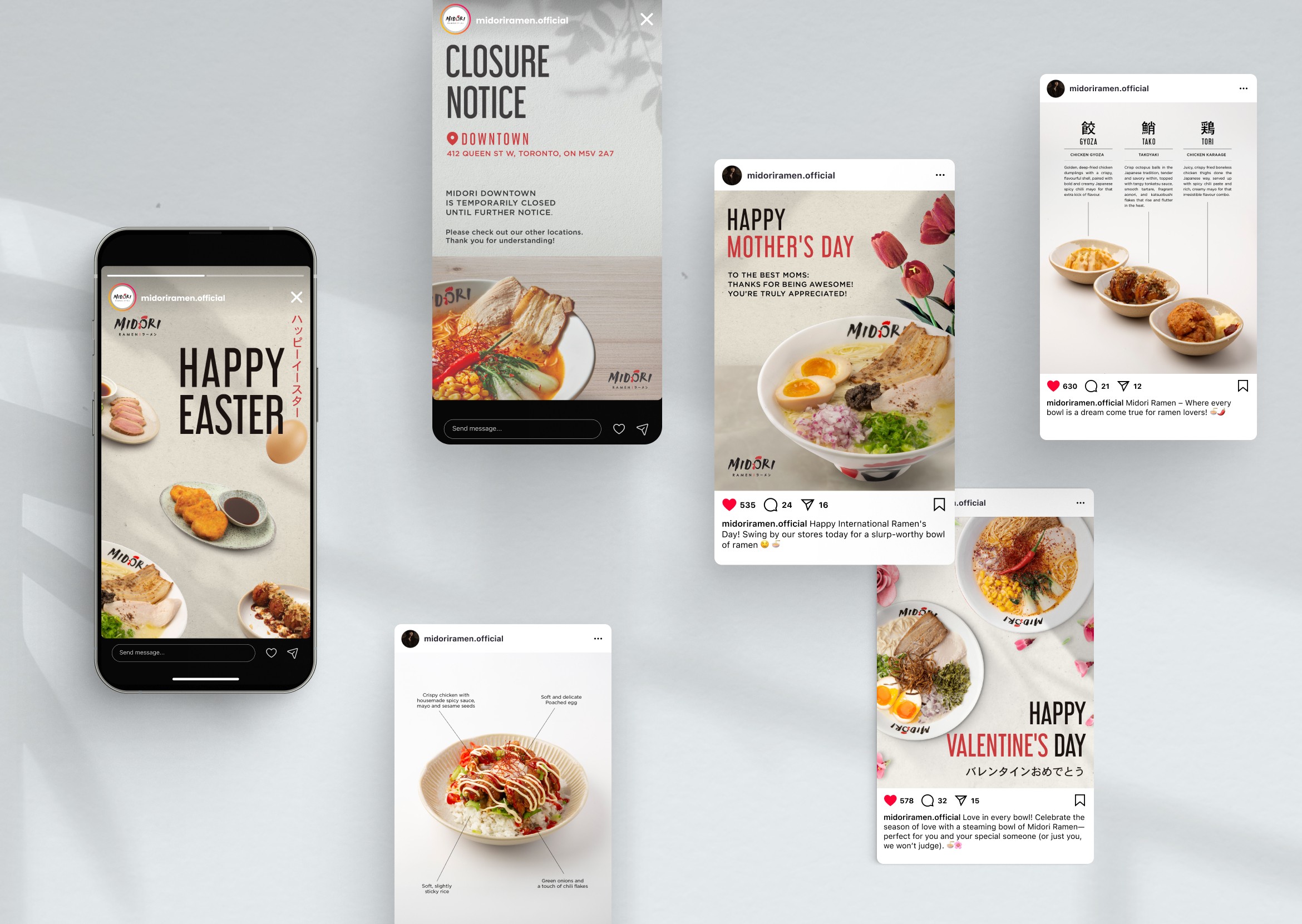 I helped Midori, a ramen spot built on the Japanese spirit of omotenashi hospitality, bring their brand to life through design. From daily menus to seasonal campaigns, I created both print and digital visuals that felt as thoughtful and inviting as their food. Every layout was crafted to feel cohesive, warm, and true to the care they put into every bowl.