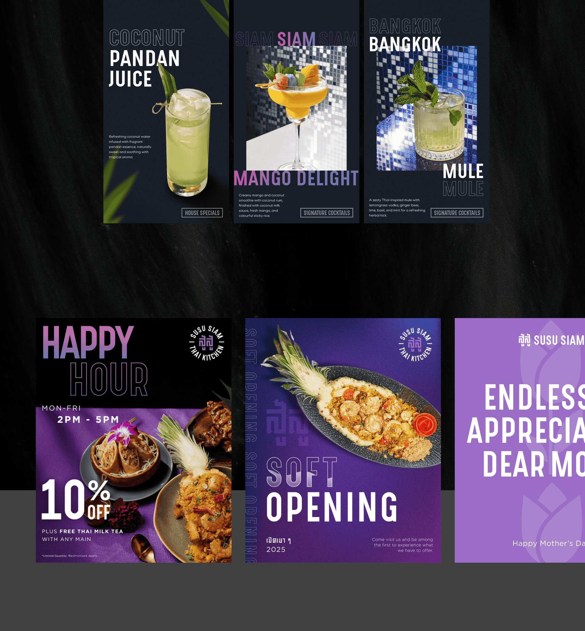 For these works, I handled the visual development for Susu Siam’s social channels. The challenge was taking their traditional Thai roots and making them feel fresh and relevant for a digital audience. I focused on building a cohesive look that captures that "authentic-meets-modern" vibe, basically making sure the brand feels just as welcoming and "Bangkok-inspired" online as it does when you’re sitting in the restaurant.